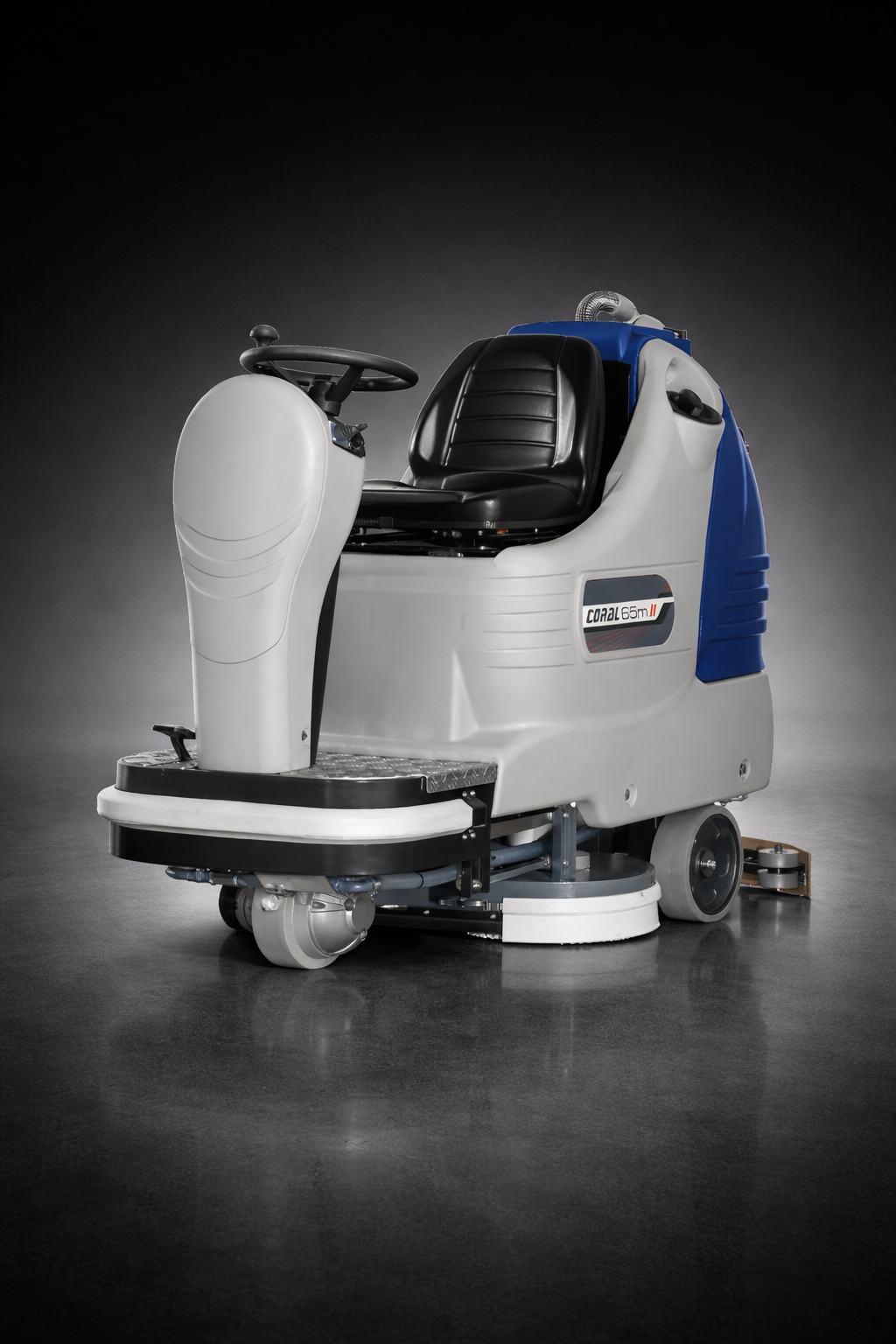 Kompakte und sehr wendige Aufsitzmaschine, Bürstendeck mit zwei gegenrotierenden Bürsten, Arbeitsbreite 65 cm. Der Saugfuß gewährleistet trotz seiner geringen Länge in jeder Situation eine perfekte Trocknung.
